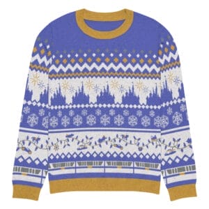 Wrap yourself in holiday magic with the Magic Holidays Sweater! This festive knit features a playful castle silhouette, monorail border, and holiday icons for a cozy blend of Disney-inspired park spirit and winter charm. Perfect for everything from family gatherings to winter park days. Cozy up and let the magic shine!